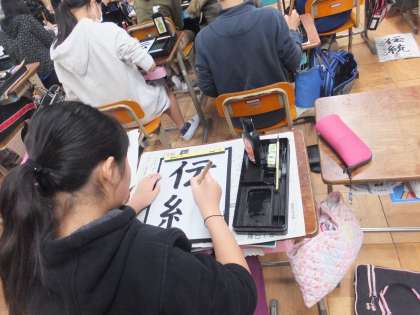 6年生の毛筆の学習で「伝統」を書きました。これまでに習ったとめ・はね・はらい,字のバランスなどを意識して書いていきました。