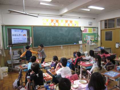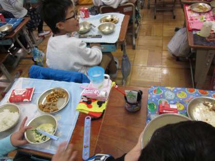 今日の給食は子ども達が大好きなかきたま汁と豚の生姜焼きと五目煮豆でした。