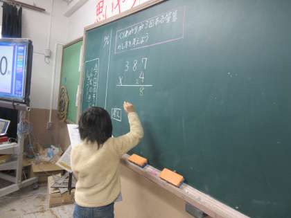 算数は「1けたをかけるかけ算の筆算」の学習をしています。