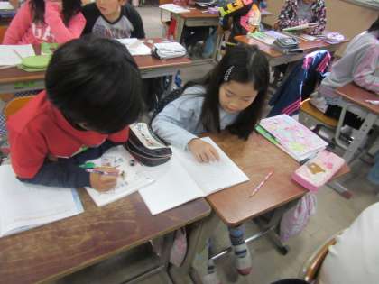 一人で考えたり,考えたことを隣の人と意見交換したり,