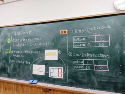 理科「電磁石の性質」の学習で,電磁石が鉄をひきつける力をもっと強くするにはどうすればよいかを考えました。子ども達からは電池を増やす,コイルの巻き数を増やすなどの意見が出てきました。次時は,実験をすることで予想を確かめます。