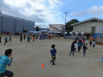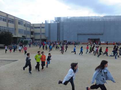 1月12日(火)高学年の全校ランニングを行いました。1周150mのコースを5分間で何周できるか,それぞれの子どもたちが目標をもってがんばっています。