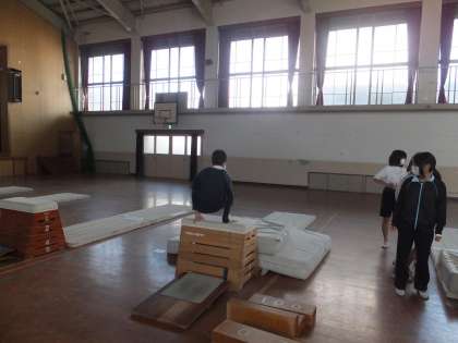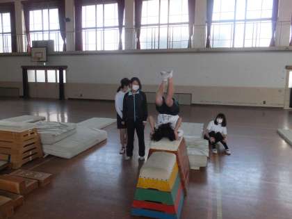 体育科の学習でとび箱運動の学習に取り組んでいます。開脚とびだけでなく,台上前転など,いろいろな跳び方に挑戦しています。