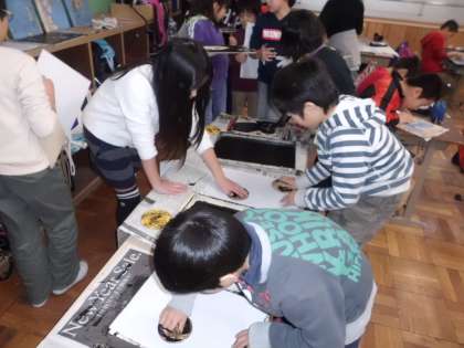 ついに彫り上げることができました。ローラーで黒インクをつけ,手のひらやばれんを使ってしっかりと紙にインクをこすりつけました。刷り上がった作品を見た子どもたちは,一様に「お〜」と歓声をあげていました。