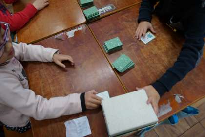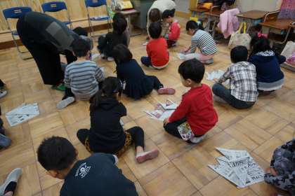 この前は,女性会の方に昔遊びやかぶとの作り方を教えていただきました。