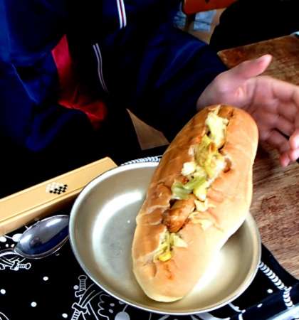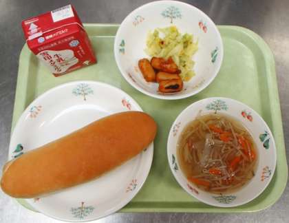 今日は,コッペパンにホットドッグの具をはさんで作るセルフサンドの日でした。子どもたちは,スプーンで切目を入れ,具をはさみ,おいしそうに食べていました。