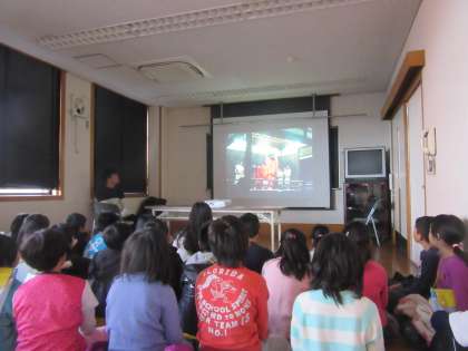コミュニティセンターで六斎念仏の演目の一つである獅子舞をDVDで鑑賞しました。すごくダイナミックな演技で子どもたちは興味深々に見入っていました。鑑賞が終わった後には獅子舞をやってみたいという声も聞こえてきました。