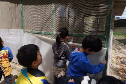 大きな体育館やバスケットゴール,東の森の生き物に子どもたちも興味津々でした。