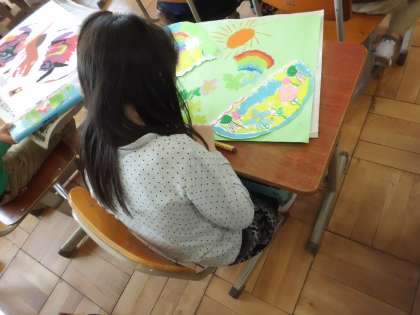 子どもたちは、たまごの殻の模様から描いていき、中から生まれてくるものを絵で描いています。