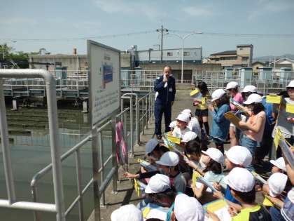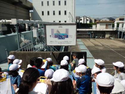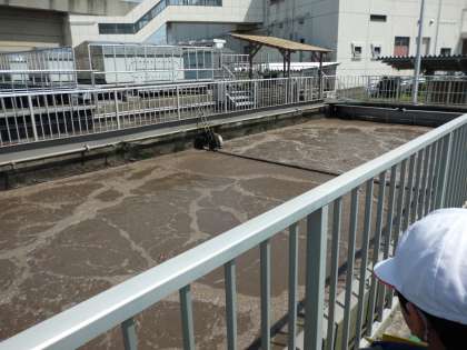 施設の見学では,職員の方と一緒に,流れてきた下水がどうなるのか,6つのポイントを回っていきました。それぞれのポイントでは,パネルを使って「スクリーンというもので,大きなごみを取り除きます」「微生物を使って,汚れを食べてもらいます」と,職員の方が説明して下さり,子どもたちはみな真剣に耳を傾け,メモを取っていました。最初は汚れていた水が最終的にきれいな水になっているのを実際の目で見て確認することもできました。