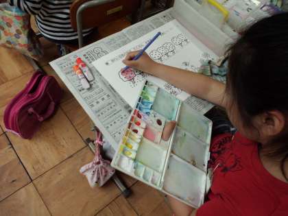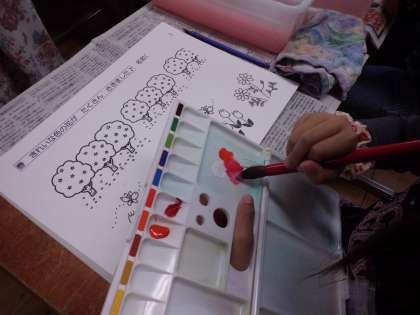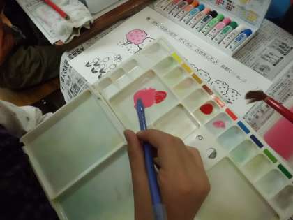 図画工作科「絵の具でゆめもよう」の学習に取り組んでいます。まずは,絵の具の正しい準備や使い方をおさらい。そして,いろいろな色をパレットで混ぜて作り出し,画用紙の花に色付けしていきました。さあ,次はいろいろな用具を使っての作品づくりです。