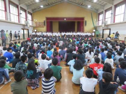 朝会で音楽の話がありました。その中で6年生が見本となって翼をくださいの二部合唱を行いました。歌を歌った後,歌を歌う時に工夫していることなどを子ども達は下級生に伝えていました。子ども達の二部合唱に歌声が体育館に響いていました。