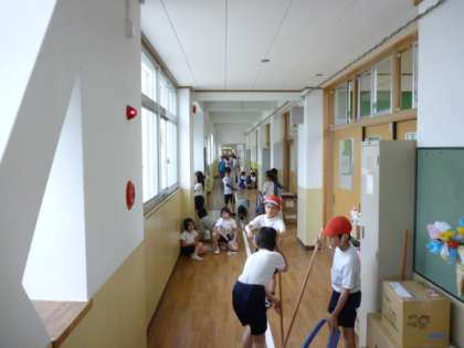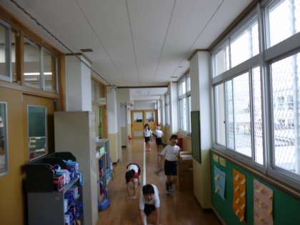 教室前の長い廊下ですが,各クラスで分担をして雑巾がけをしています。