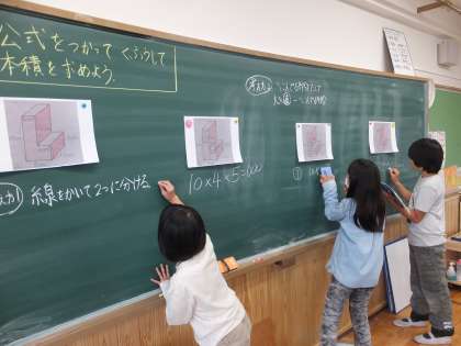 たてや横にを引いて2つの直方体を足す方法や,大きな直方体から補った直方体を引く方法を考え,説明し合いました。