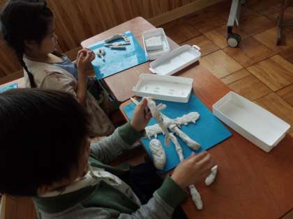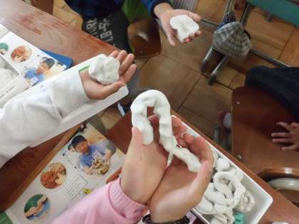 子ども達は、ねん土をにぎり、にぎったねん土が何に見えるか考えました。