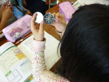地図は北を上にして表すことや東西南北など方位磁針を使って確認しました。
