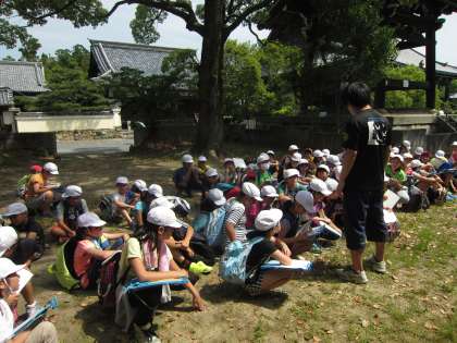 清凉寺で,ウォークラリーの説明を受けて,いよいよスタートしようとしています。とても良い天気で遠足日和です。