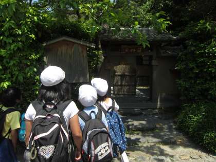 班ごとに分かれて嵯峨・嵐山をウォークラリーしています。看板には何と書いてあるかな!?問題を解いています。
