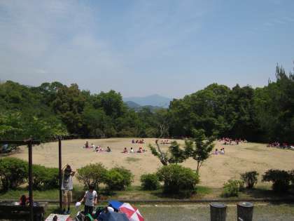 ウォークラリーのゴール地点である亀山公園で,ごはんを食べます。班ごとにシートを広げてお弁当タイムです。