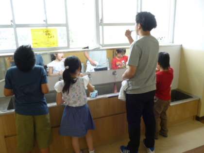 給食後,手洗い場で歯を磨いています。