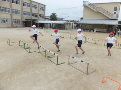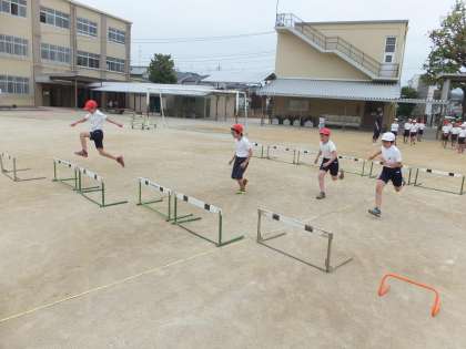 運動会に向けて50mハードル走の練習を行いました。まず,自分のインターバルを見つけます。ハードルを越えて,次のハードルまで3歩でスピードを落とさずに走ることができるインターバルを探しました。