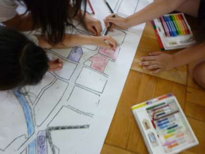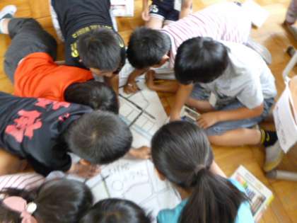 家があった場所を赤でぬったり,田や畑を緑でぬったり,川を青でぬったりみやすいようにグループで工夫しました。