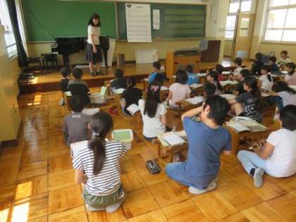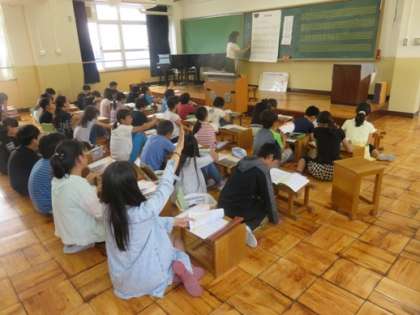 「おぼろ月夜」の範唱を聴いて歌詞唱しました。今回は,季節はいつなのか?時間はいつなのか?情景を想像しながら歌を歌いました。次に,旋律の流れや曲の山を感じ取り,強弱記号の意味を理解して,表現を工夫して歌詞唱しました。