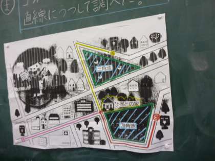 コンパスを使って3つの道の長さを比べました。