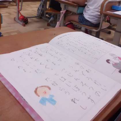 運動会のことを「あのねちょう」に書きました。書き始めの1マス空けや,文末に句点をつけることに気をつけて書きました。うれしかったことやくやしかったこと,がんばったことなど,自分の気持ちを文にでき,満足そうな顔が見られました。