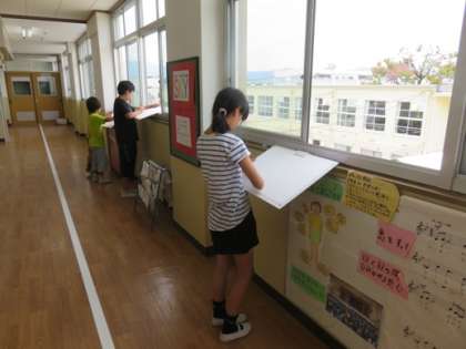 毎日の学校生活の中から大切に思う風景を見つけ,絵に表すことに取り組みました。教室,階段,東の森,くすのき,運動場にあるバスケットゴールなど子どもたち一人ひとり大切に思う風景は違います。大切な風景の季節,時間,どの角度から見た風景なのかなどを考えながら大切な風景を見つけています。