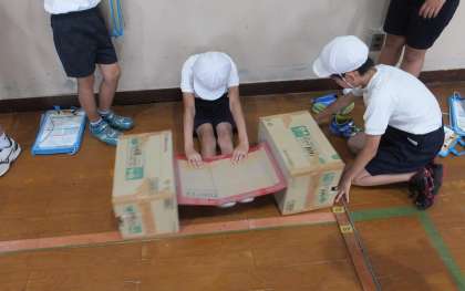 運動場では,ソフトボール投げ,体育館では立ち幅跳びや上体起こし,反復横とびや長座体前屈を行いました。