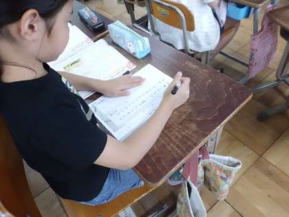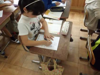 書写では「配列に気をつけて書こう」の単元に取り組みました。行の中心を考えたり,漢字と平仮名の文字の大きさに気をつけたりして,サインペンで書きました。