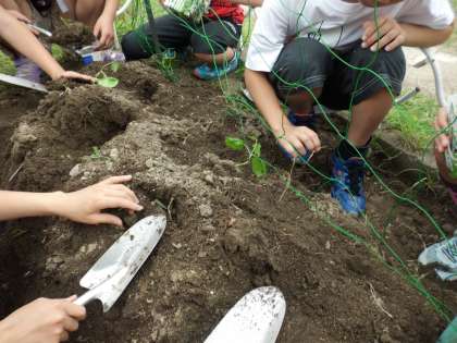 理科の学習で育てているツルレイシが大きくなってきたので,花壇に植えかえました。もっともっと大きくな〜れ!