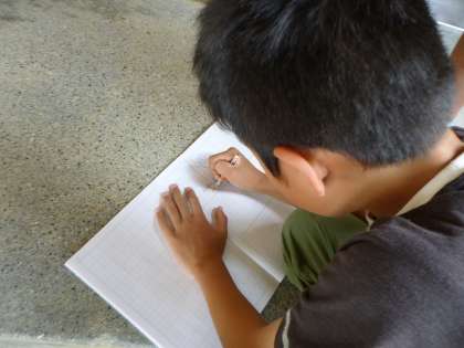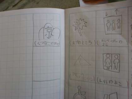 「確か体育館にあったあの記号が気になる!」と非常口の記号をノートにメモしていました。