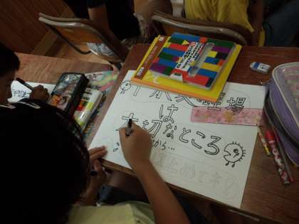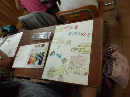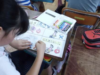 社会科「使った水のゆくえ」では,学習で分かったことや下水道のよりよい使い方をポスターにまとめました。「石や油は流さない」「水環境保全センターは川をきれいにしてくれている」など,絵に伝えたい言葉を添えてポスターを作り上げました。
