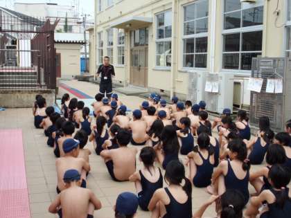 体育科では「水泳」の学習が始まりました。準備体操や水慣れの仕方など,学習の準備のやり方を一斉に確認した後,さっそくねらい1「いろいろな水遊びにちょうせんして楽しもう」に取り組みました。学習カードを見ながらバディで協力し合って,自分たちの課題をクリアしていきました。初めての水泳学習でしたが,学習のルールや進め方には慣れることができたようです。