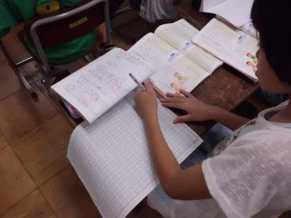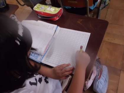 国語科では意見文作りに挑戦。自分の意見を述べた後,理由とその事例を段落ごとに分けて書いています。教科書を見て,書き方を確かめています。