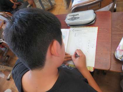 理科の学習で人の体のつくりとはたらきを学習しました。口からとり入れた食べ物は,どのようなしくみで体の中に吸収され,どこへ行くのか考えました。そして各器官の位置を絵を用いてまとめました。