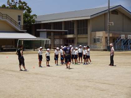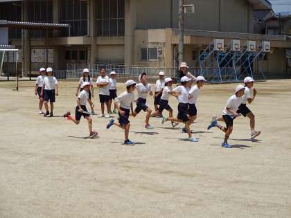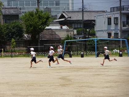 暑い日差しの中,いくつかのグループに分かれてスタートダッシュやバトンパスの練習をしました。
