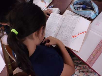 国語科では「いろいろな意味をもつ言葉」という単元で言葉の学習をしました。辞書を使って「あがる」「みる」「つく」などの言葉には,たくさんの意味があることを確かめました。そして,「ひく」「かける」の言葉を使って,川崎洋さんの「とる」のような詩を作り上げました。