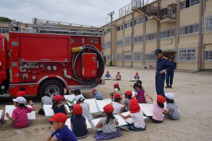 避難訓練後,消防車を見せてもらい,子どもたちは絵を描きました。