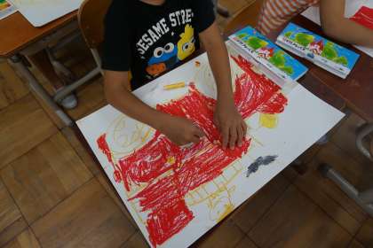 赤色のクレパスがもう半分になってしまうぐらい,たくさん使いました。