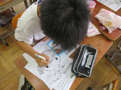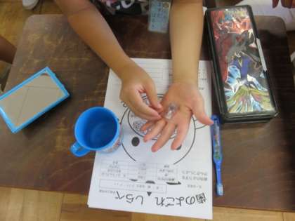 歯磨き習慣の取組で,歯磨きの学習をしました。最初に歯ブラシの持ち方や歯の磨き方を学習して,カラーテスターを使って歯磨きが出来ているか確かめました。子ども達は日頃の歯磨きを振り返ることが出来,次の日からも歯磨きを頑張ろうという気持ちでいました。