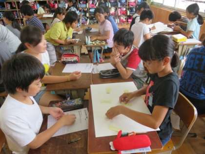 総合的な学習の時間の時間で京都の魅力について話し合いました。子ども達は自分達が知っている京都の魅力を付箋紙に書いて紹介し,グループ分けをしました。世界遺産,食べ物など,自分たちで考えていました。