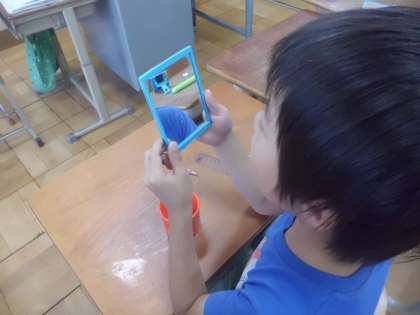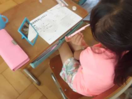 歯みがき週間にカラーテスターを使って,みがき残しのチェックをしました。チェックをした後は,歯みがきの正しいやり方をもう一度,確認しました。子ども達は,鏡を見ながら一生懸命に歯みがきをしていました。