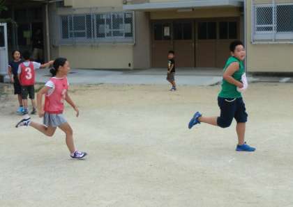 梅雨の晴れ間に,運動場で動き回って