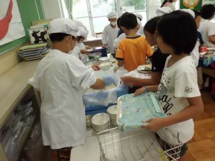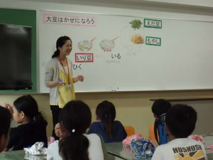 6月に入り,4年生になって初めてのランチルームでの給食。栄養教諭の山田が大豆はいろいろな食べ物に変身しているということを,実物を交えながら紹介。興味津々で聴いていた子どもたち。いつもと違った雰囲気の中,給食もいつも以上においしく食べられました。