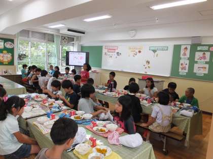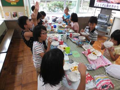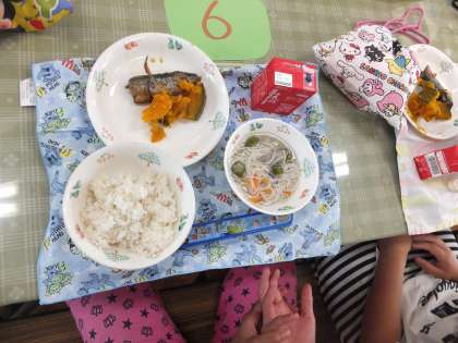 普段と違う教室や食器を使って,おいしく楽しく給食をいただくことができました。「全部おいしかった」「魚は骨まで食べられた」「かぼちゃが甘くておいしかった」など,たくさんの感想を話してくれました。