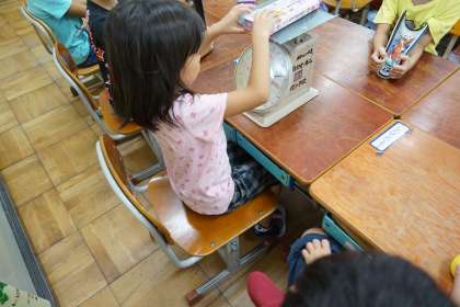 1年生ははかりでいろいろなものを量っている様子を絵に表します。