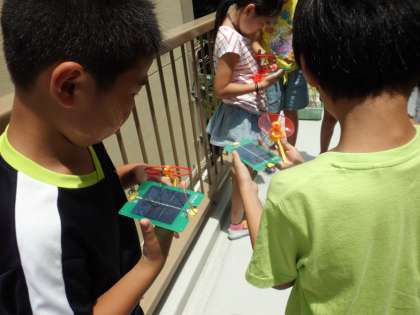 理科「電池のはたらき」では,光電池を使ってモーターを回しました。光の当て方を変えることで,モーターの回るスピードが変わることに気づいた子どもたちでした。